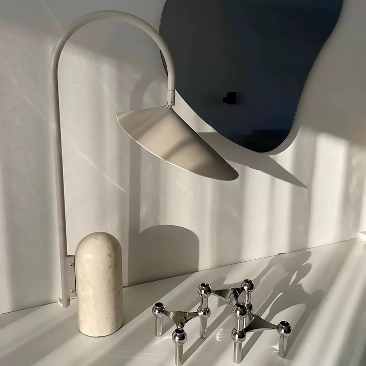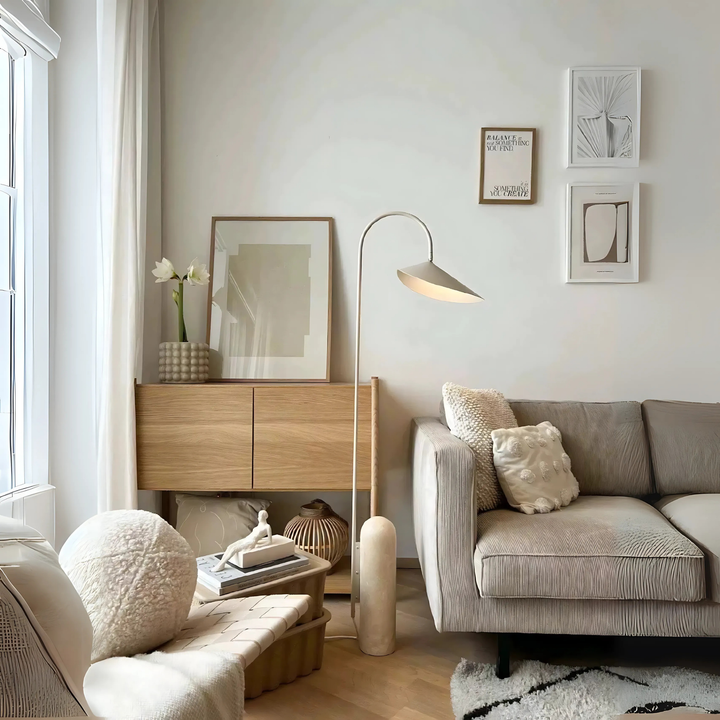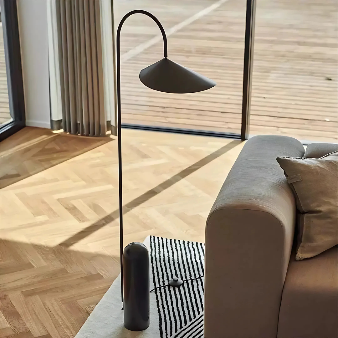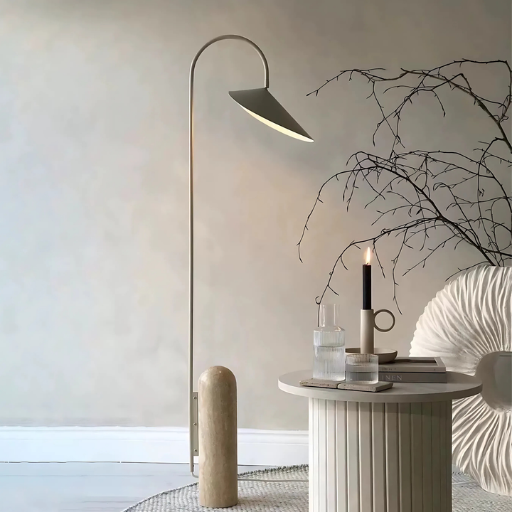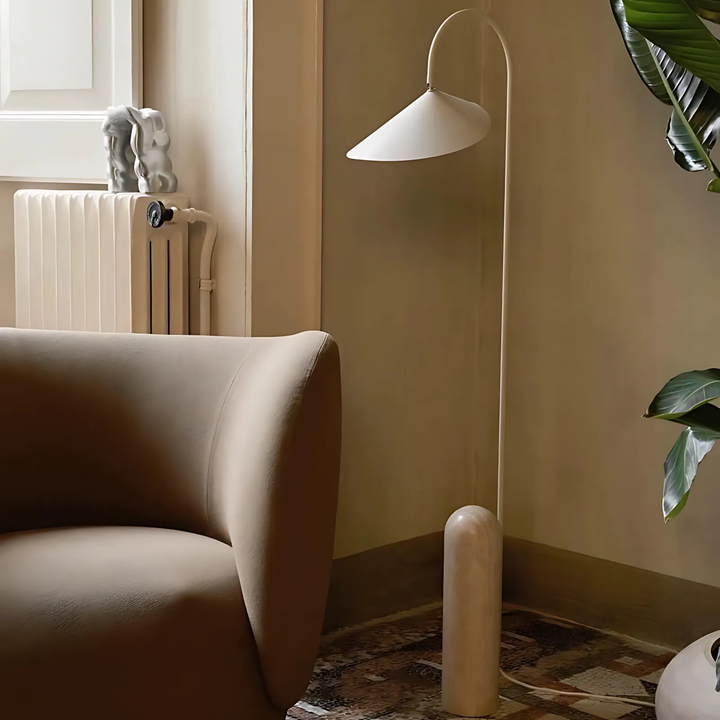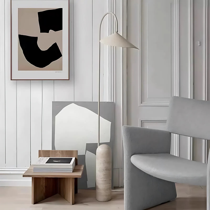 The ARIA Floor Lamp combines a solid travertine stone base with a slim iron stem and a clean, domed iron shade. The porous texture of natural travertine adds a sculptural, French-inspired touch, while the minimalist profile suits living rooms, bedrooms, studios, boutique hotels, and showrooms. Standing 136 cm tall with a 42 cm diameter shade, it provides a warm, focused glow beside sofas and reading chairs.