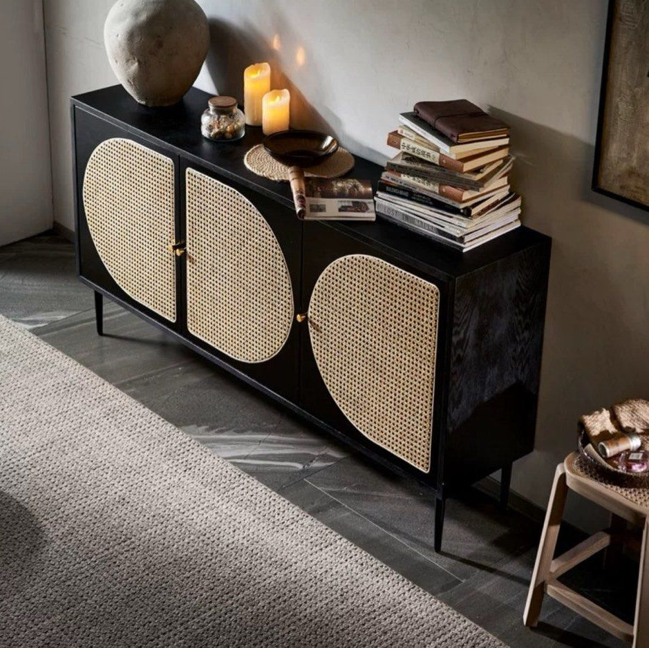 The AUZO Modern Solid Wood Sideboard with rattan features a sleek and contemporary design, crafted from high-quality solid wood. Its notable inclusion of rattan detailing adds a touch of natural texture, creating a stylish and versatile piece for storage and display in your living space. With clean lines and a warm wood finish, it seamlessly blends modern aesthetics with a hint of rustic charm.
