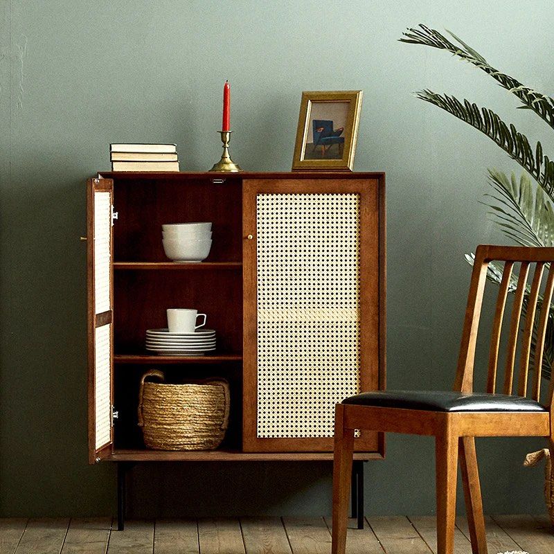 Add a touch of nostalgia to your decor with the Bentley cabinet. Crafted from durable wood, this cabinet features a rich medium oak finish that exudes warmth and coziness. Behind the double doors, you’ll find two spacious shelves that offer ample storage space for all your essentials, keeping them neatly organized and tucked away from view. The woven rattan accents give the cabinet a breezy bohemian feel, while the angled legs and long wooden handles lend a retro mid-century vibe that will transport you back in time. Whether you’re decorating a cozy den or a stylish living room, the Bentley cabinet is the perfect addition to create a stylish and functional space.