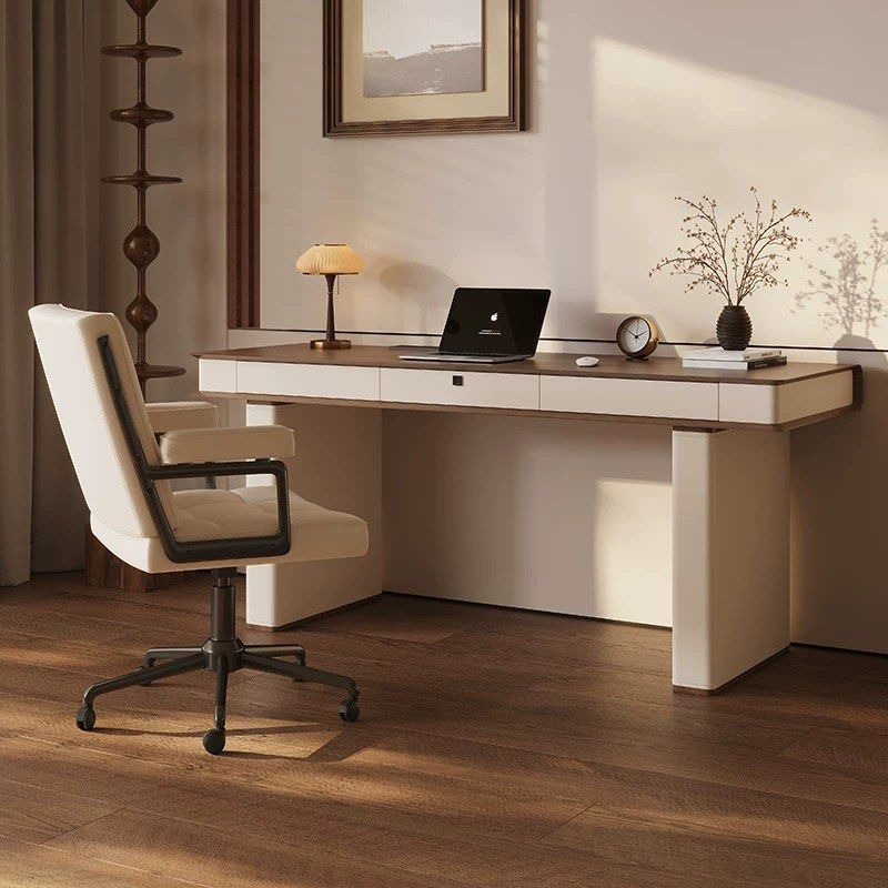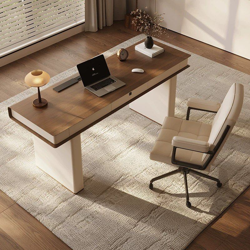 The BERRYE Modern Solid Wood Study Table is a stylish and functional desk crafted from solid oak wood and features saddle leather accents. It includes three drawers, one of which has a convenient thumbprint function for secure access. The combination of durable oak construction and premium leather detailing gives it a sophisticated, modern aesthetic while offering practical storage solutions. Ideal for home or office use, this desk blends elegance with innovative security features.