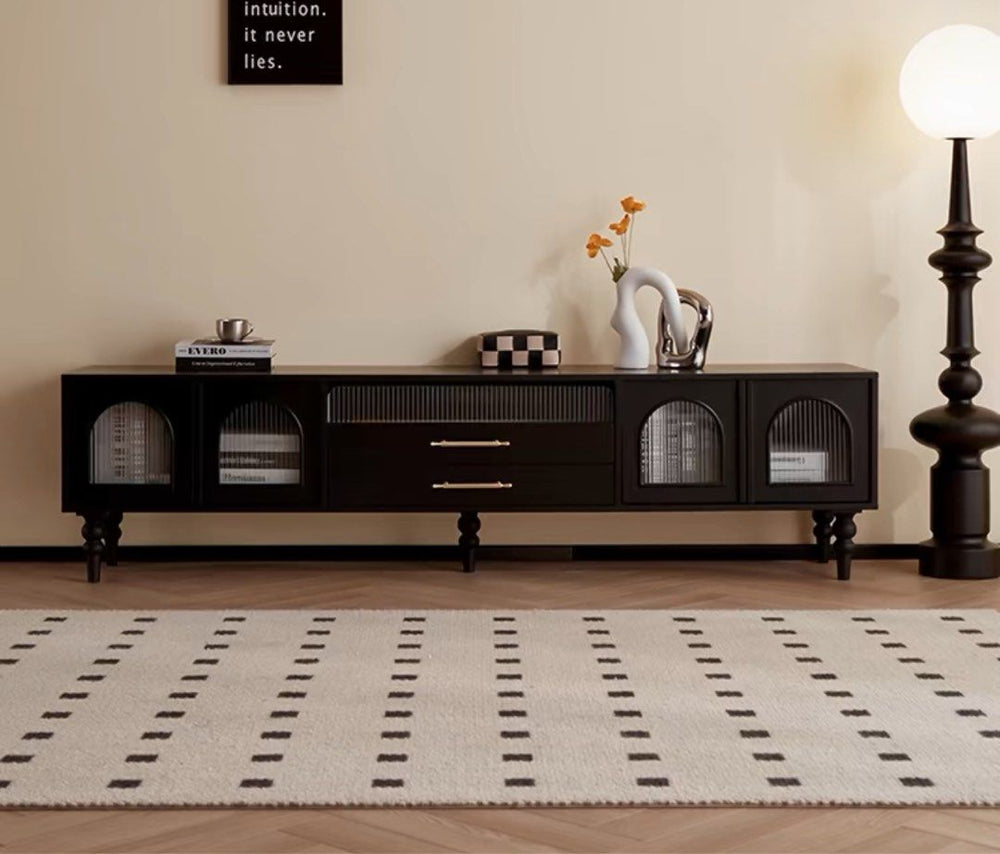 Transform your living area with our CALVE modern TV cabinet. This chic furniture item incorporates mid-century design elements with a touch of contemporary sophistication. Its adaptable style effortlessly harmonizes with diverse interior decors, making it a perfect enhancement for any space. With a combination of open shelves, drawers, and cabinet doors, this TV stand offers generous storage space, elevating your home with practicality and style.