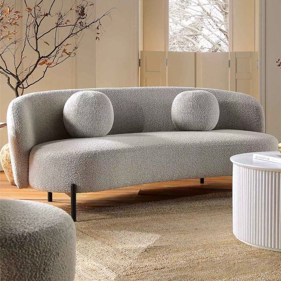 The TALARA Modern Curve Sofa is a sophisticated piece designed to bring both comfort and style to contemporary interiors. Upholstered in a blend of boucle fabric and cotton-linen fabric, the sofa offers a soft, textured surface with the tactile richness of boucle and the breathability and durability of cotton-linen. The boucle fabric, with its signature looped weave, adds depth and visual interest, while the cotton-linen blend provides a smooth, natural finish that complements a variety of décor styles.