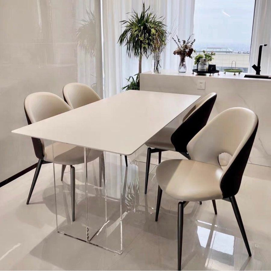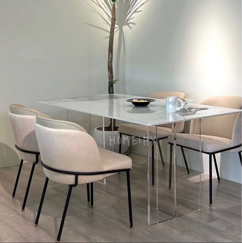 TAVERAS Minimalist Dining Table is a striking and contemporary piece of furniture that combines simplicity with a touch of modern elegance. The standout feature of this table is its legs, which are crafted from transparent acrylic. These legs give the illusion of the tabletop floating in the air, creating a sense of spaciousness and lightness in the dining area. The acrylic legs are designed with clean, straight lines, adding to the table's minimalist appeal.
