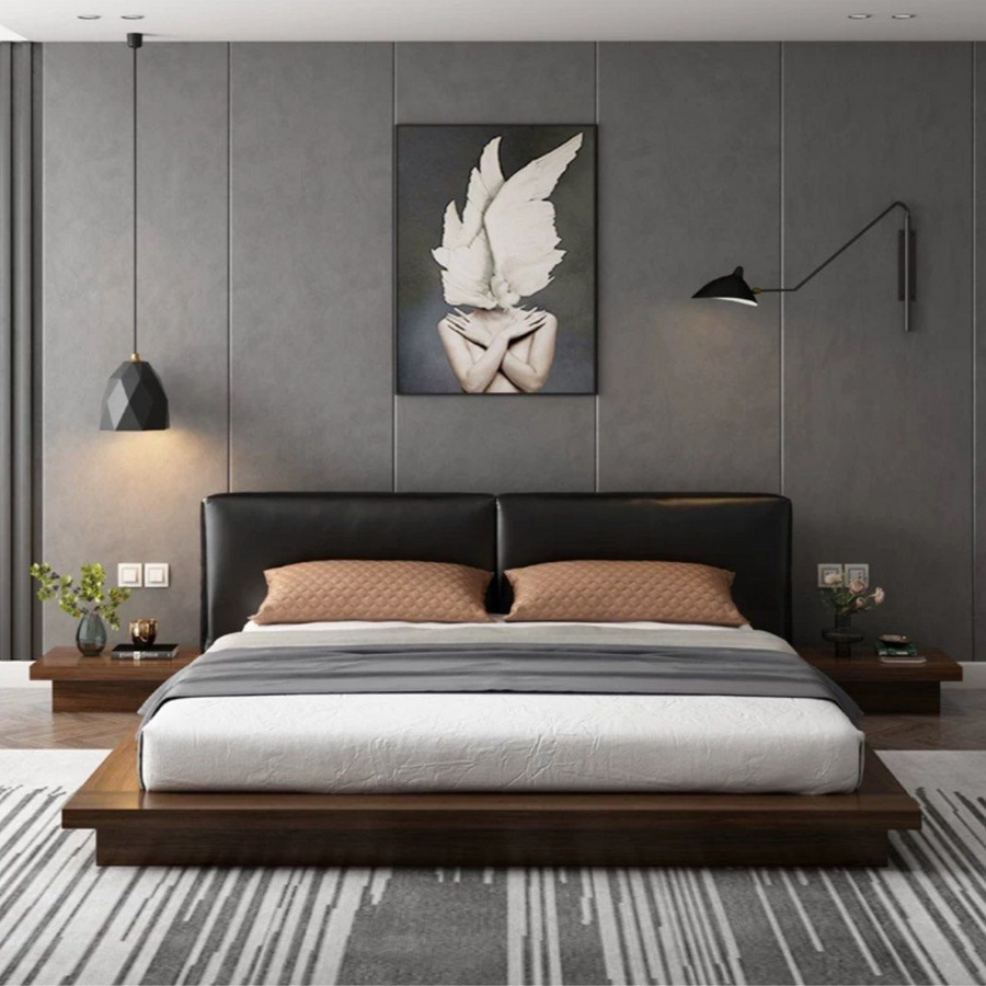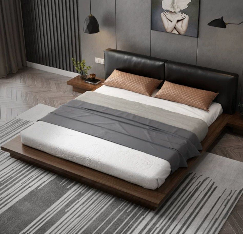 Highlighted by a platform base adorned in a deep, lustrous walnut finish, the standout feature of our TAVIKA bedframe is its expansive headboard cushions, luxuriously upholstered in soft faux leather. Indulge in the sumptuous texture and modern aesthetics that this platform bed contributes to your contemporary, minimalist, or Japanese-inspired setting. Engineered for both style and comfort, this bedframe effortlessly blends form and function. Immerse yourself in the captivating ambiance of a stylish bedroom sanctuary with this understated yet attention-grabbing bedframe.