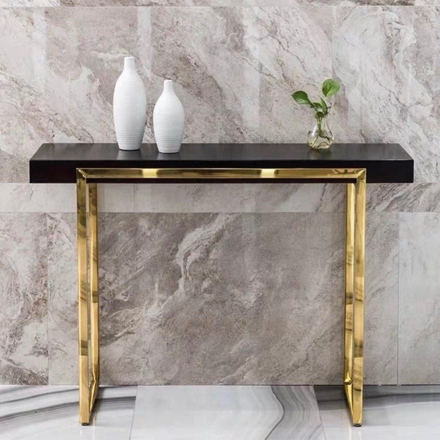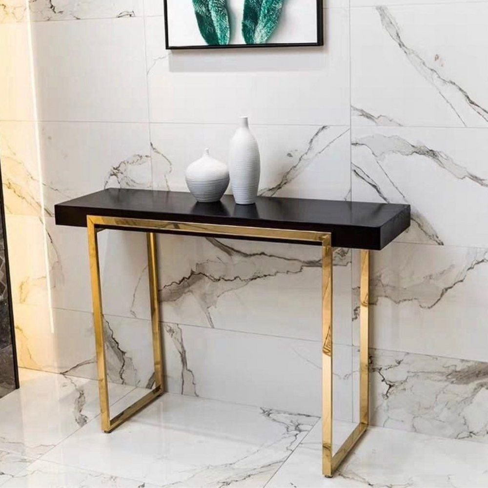 An exquisite embodiment of minimalistic elegance, the THALES hallway console is a timeless accent that will grace your living space. Its glossy laminated tabletop, encircled by and delicately poised on chrome gold legs, emanates a sense of classic sophistication. This console serves as an ideal platform for showcasing your cherished trophies, photographs, and curated accessories, elevating the aesthetic appeal of your environment.
