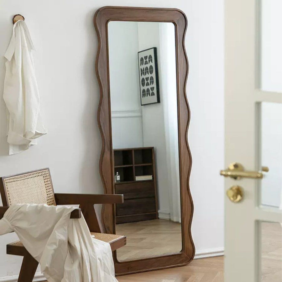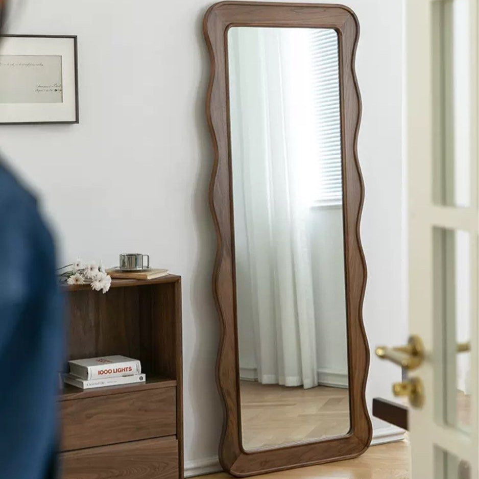 Enclosed within a robust wooden frame, the UTONE wall mirror stands out with a distinctive water droplet silhouette embraced by a substantial walnut border. This one-of-a-kind design allows for versatile placement, making it suitable as a bathroom mirror or an eye-catching accent in your hallway, living room, bedroom, or office. The mirror's shape and material introduce a natural element to your living space, transforming it into a focal point that effortlessly complements any modern, eclectic, or contemporary interior. With its reflective charm, this mirror not only showcases your style but also enhances the perception of space in diverse settings.