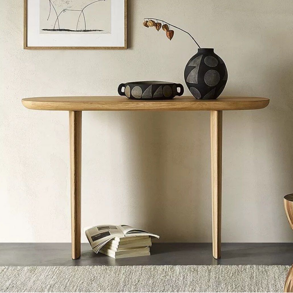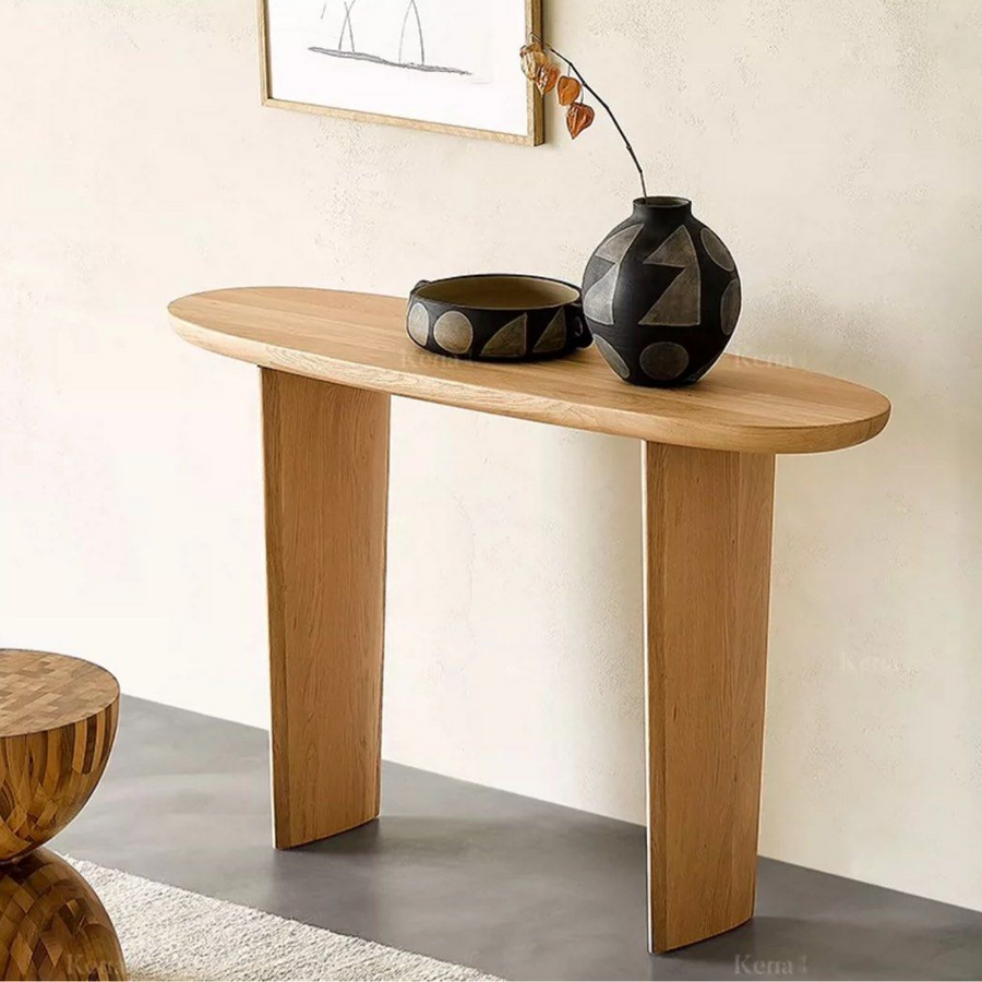 The VARICK Modern Solid Wood Console Table, constructed from robust solid oak wood, showcases a blend of timeless charm and contemporary design. Its sturdy build and rich oak finish provide durability and a warm aesthetic. With clean lines and a sleek silhouette, this console table effortlessly complements modern interiors. The natural grain patterns of the oak wood enhance its visual appeal, making it an exquisite and versatile addition to your living space.