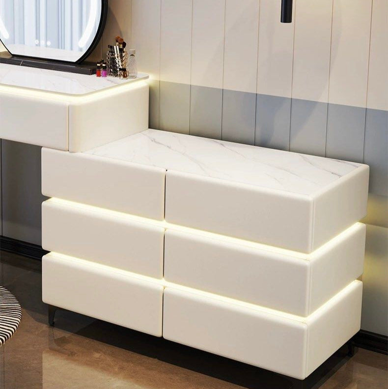 Enhance your bedroom with our VEDON dressing table. Made from durable fiberboard and topped with a glossy sintered stone surface, this elegant piece suits both modern and classic styles. With a side cabinet offering ample drawer space for your beauty products and accessories, this dresser is a functional and stylish addition to any bedroom, whether you prefer a sleek, contemporary look or a timeless, classic design.