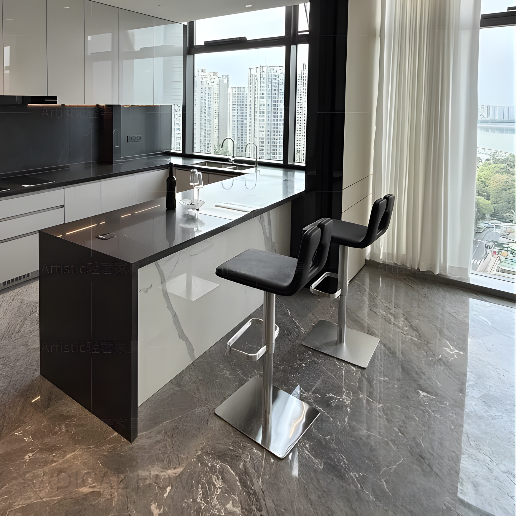 ARTYLIS Leather Bar Stool features a sculpted backrest designed for both comfort and contemporary elegance. The seat is available in your choice of genuine leather or high quality faux leather, allowing you to tailor the look and feel to your space. Its refined base can be customized as well—choose between sleek stainless steel or luxurious black titanium to match your interior style. With its clean lines, premium materials, and customizable options, this bar chair brings a sophisticated touch to any kitchen island, bar counter, or dining area.