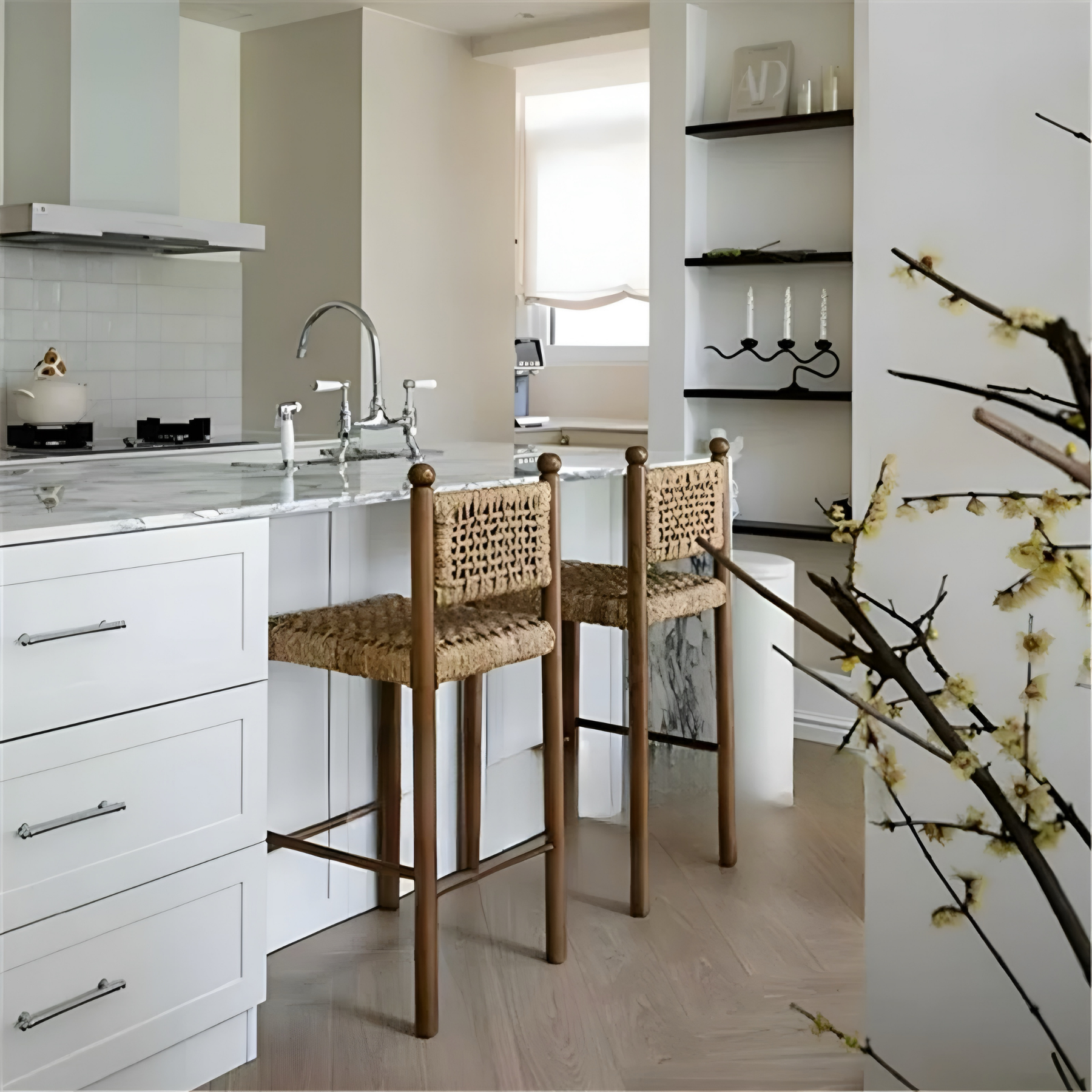 The HARBOUR Rustic Woven Bar Chair blends vintage craftsmanship with modern durability. Featuring a solid wood frame and handwoven rattan seat, this high bar chair offers a natural look that enhances kitchen islands, home bars, cafés, and restaurants. Its elevated design and flowing lines add both comfort and elegance to any space.