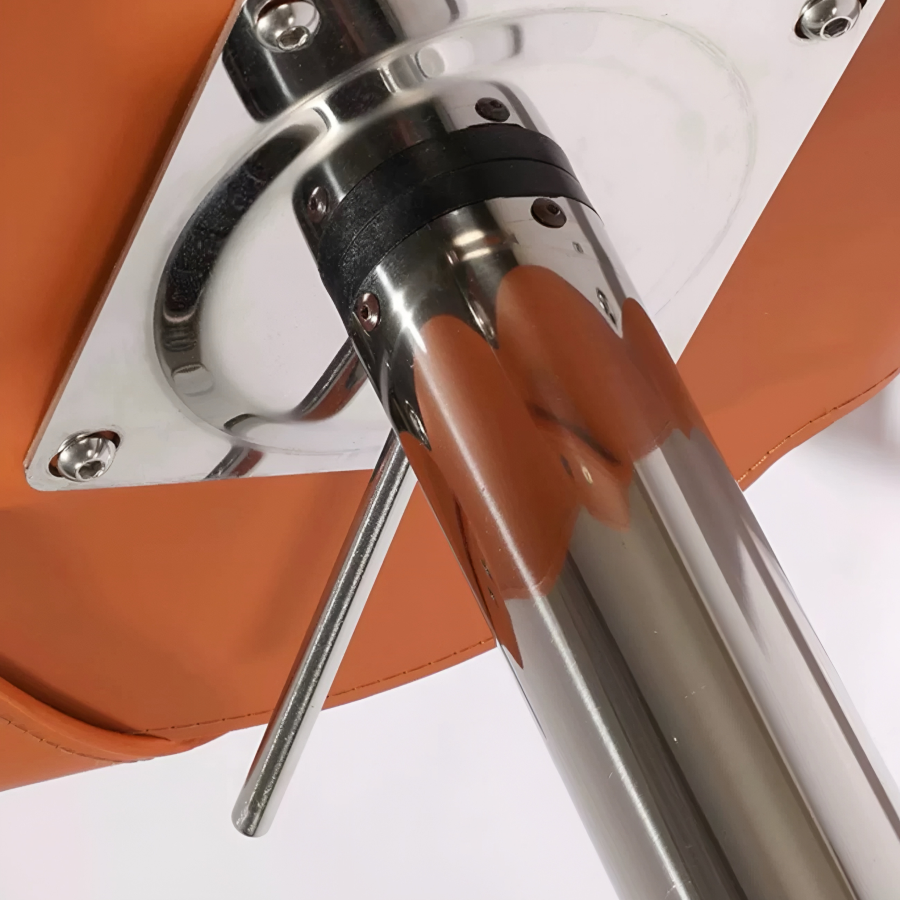 Sleek and contemporary bar stool with a saddle-style leather seat and a polished stainless steel base. Height-adjustable with a smooth gas-lift mechanism, ranging from counter to bar height. Compact yet supportive, featuring a comfortable backrest and footrest—ideal for kitchens, islands, and modern dining areas.