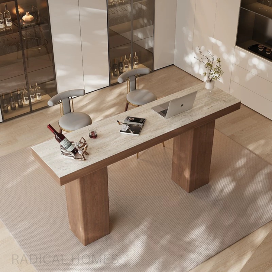 VIONA Modern Travertine & Saddle Leather Bar Table