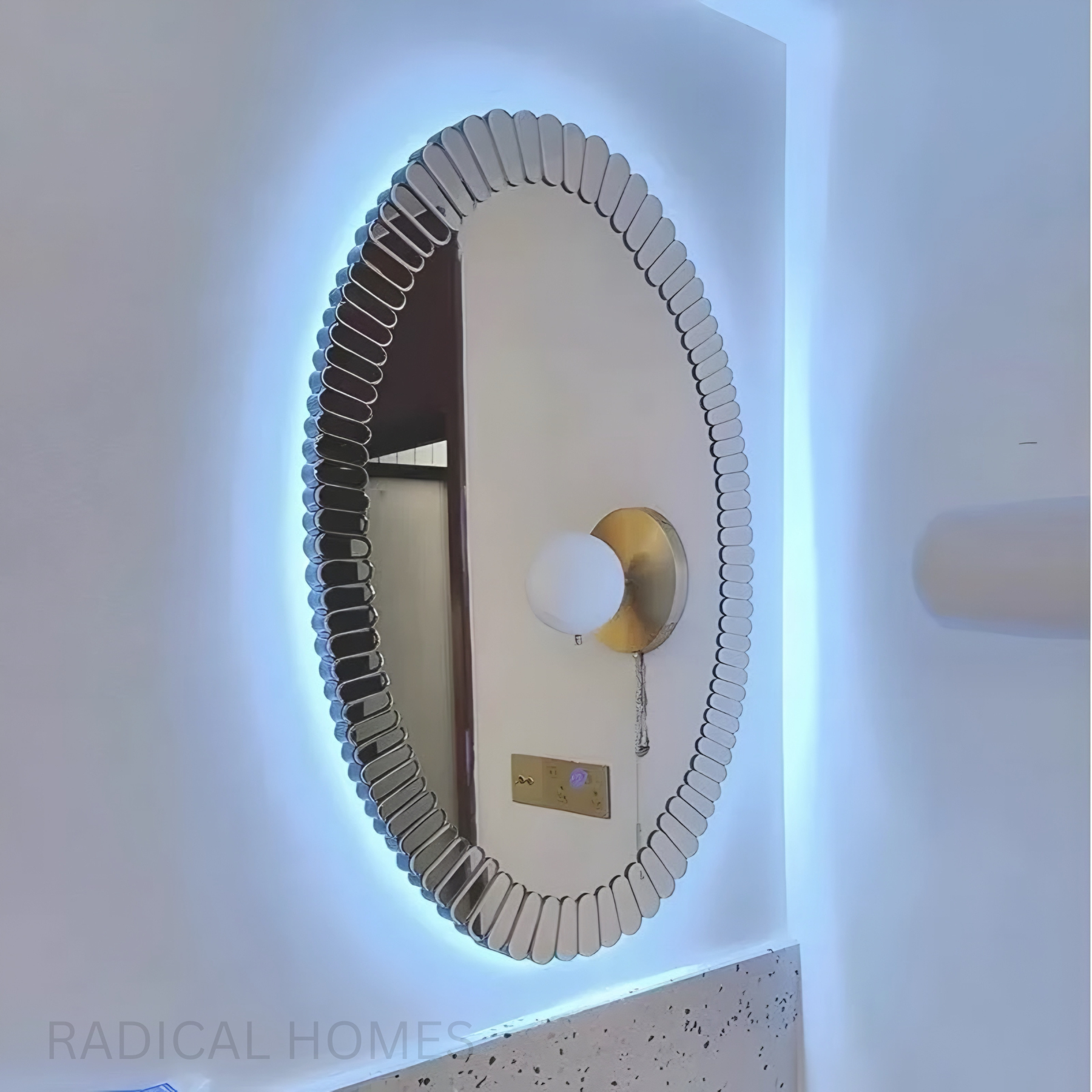 The LUCERA Modern Beveled Oval Wall Mirror is a striking blend of contemporary elegance and refined craftsmanship. Designed to elevate bathrooms, vanity spaces, and entryways, this mirror features a beautifully sculpted frame composed of multiple hand beveled glass segments each reflecting light from a slightly different angle. The result is a shimmering, jewel like halo effect that adds sophistication and visual depth to any interior. The mirror uses high definition silver coated glass, offering crystal clear reflection with excellent brightness and minimal distortion. Its oval shape introduces soft curves that complement modern, minimalist, Scandinavian, and hotel inspired interiors. Whether installed above a sink, console table, dresser, or in a hallway, the LUCERA mirror brings a luminous, artistic presence to your space. Select models include an optional touch activated LED light strip, providing gentle ambient lighting perfect for daily grooming, nighttime use, or simply enhancing the mirror’s sculptural beauty. With its luxurious beveled detailing and smart versatility, the LUCERA mirror is an ideal choice for homeowners seeking functional elegance and contemporary charm.