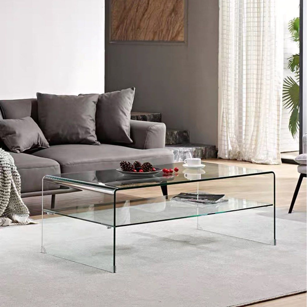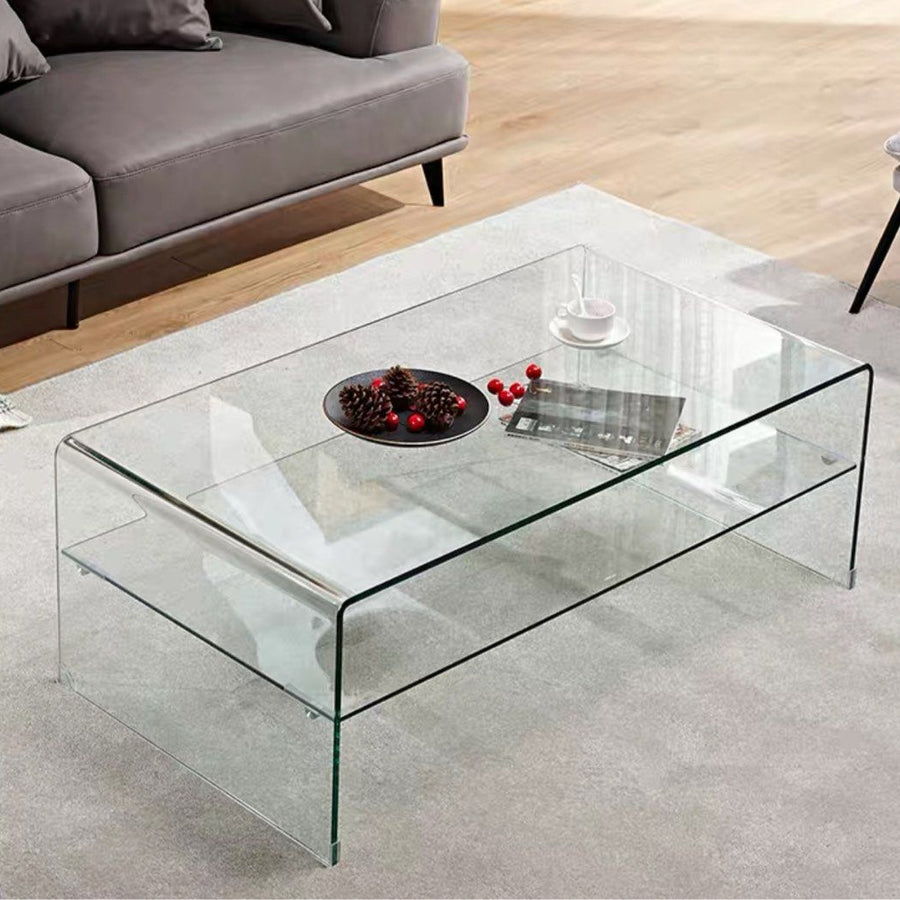 The VUE Modern Glass Coffee Table features a sleek and contemporary design with a glass tabletop supported by clean lines and metallic accents. Its minimalist aesthetic adds a touch of sophistication to any living space, combining functionality with a stylish appearance.