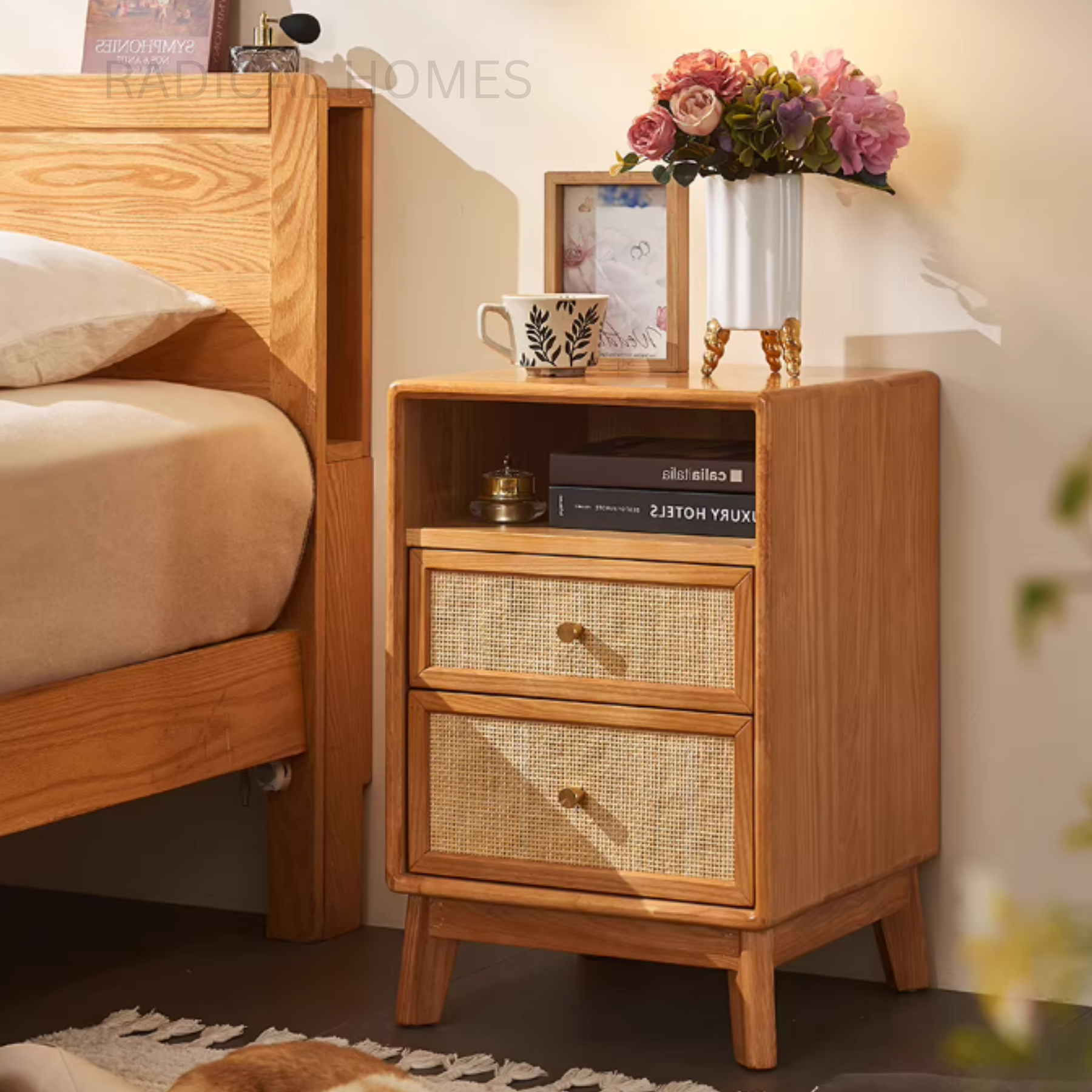 The KAVREN Rattan Bedside Table blends warm vintage texture with a clean modern silhouette. Featuring two hand-woven rattan drawers and an open top shelf, it provides both display space and concealed storage for books, décor, or nighttime essentials. The solid wood structure ensures durability while the compact footprint makes it ideal for bedrooms, studio apartments, or cosy living spaces.