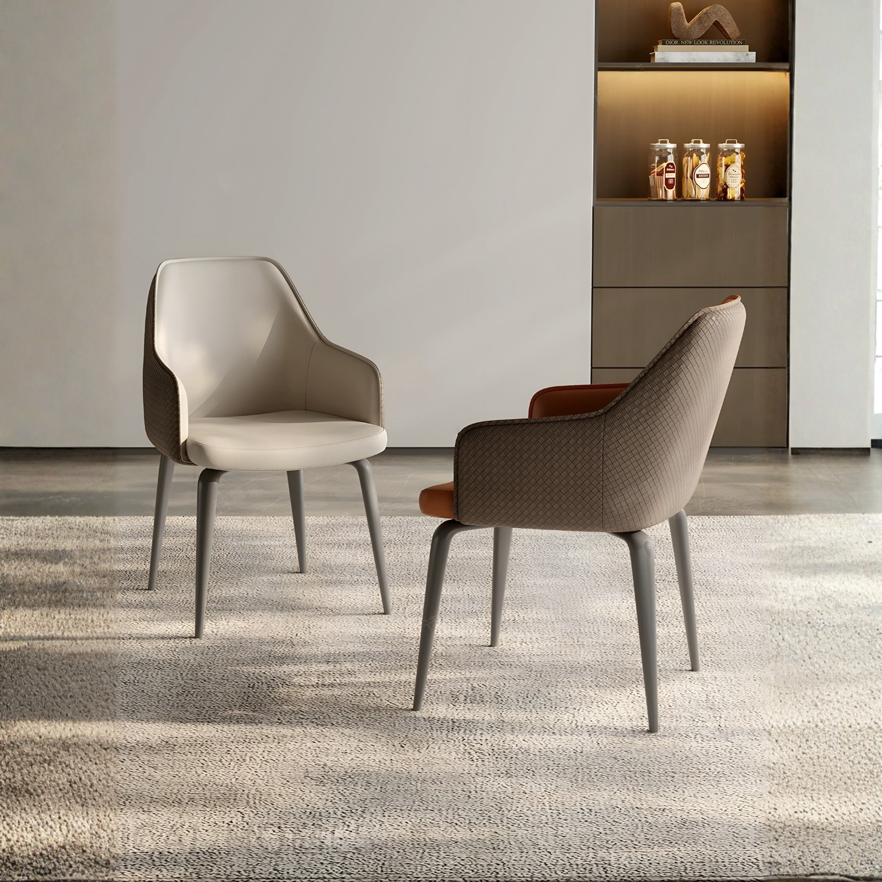 MIRELLY Modern Leather Dining Armchair is a high end Italian style dining armchair with a softly cushioned seat, wrapped armrests, and a textured back for a refined look. Supportive yet elegant, it suits dining rooms, lounges, and boutique cafés, offering plush comfort and a premium finish.
