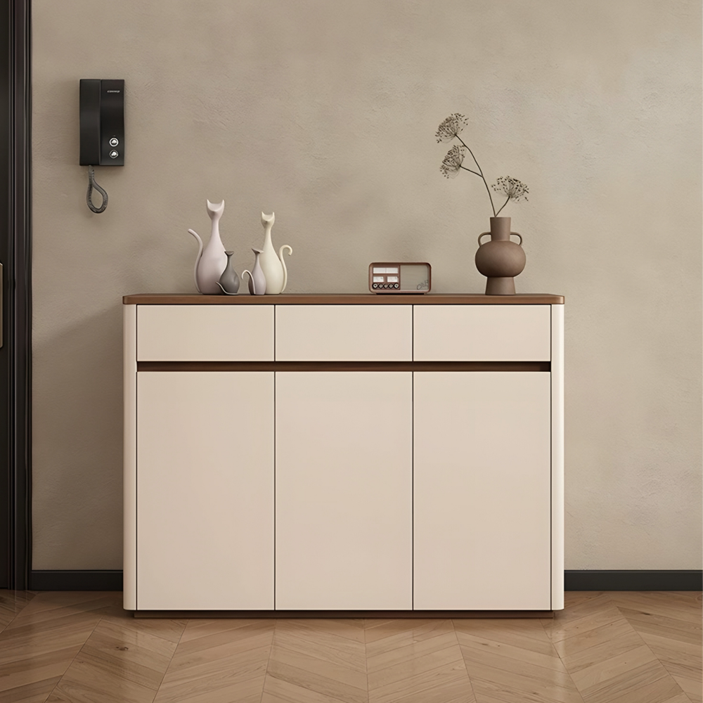 A slim modern entryway shoe cabinet with a warm walnut wood top and minimalist beige body. Designed with flip-down doors and multiple shelves, it provides ample shoe storage while maintaining a compact 31 cm depth for narrow spaces. The flat walnut top doubles as a display surface for décor, making it a functional yet stylish addition to hallways and foyers.