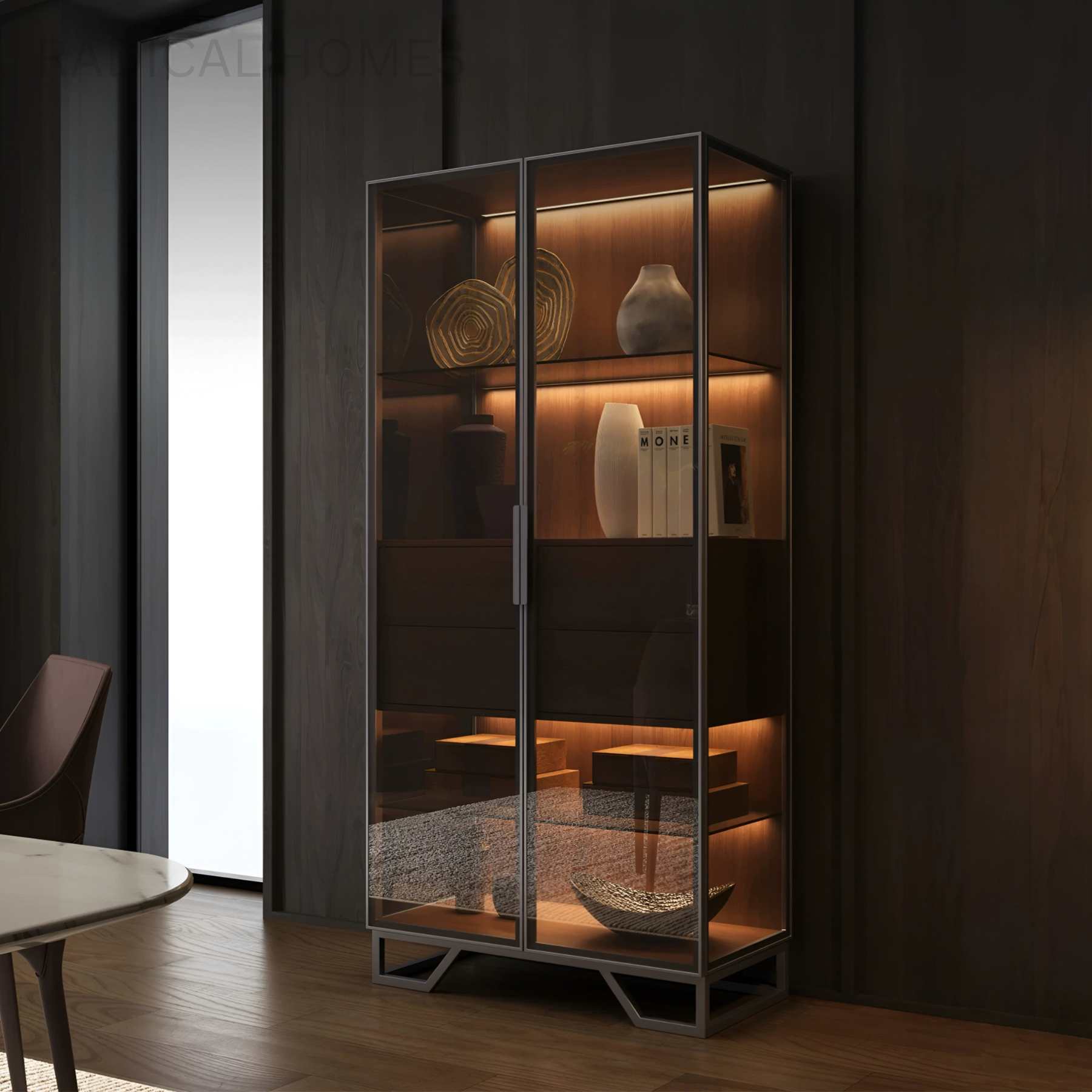 ZORVENA Modern Glass Display Cabinet combines sleek architectural lines with warm interior lighting to create a refined showcase for décor, collectibles, or wine displays. The tall glass panels provide a full view of the illuminated shelves while the rich walnut-toned frame adds depth and elegance to modern interiors. Designed to function as both storage and a statement piece, this cabinet enhances living rooms, dining areas, and luxury entry spaces with its gallery-style presentation and sophisticated ambiance.