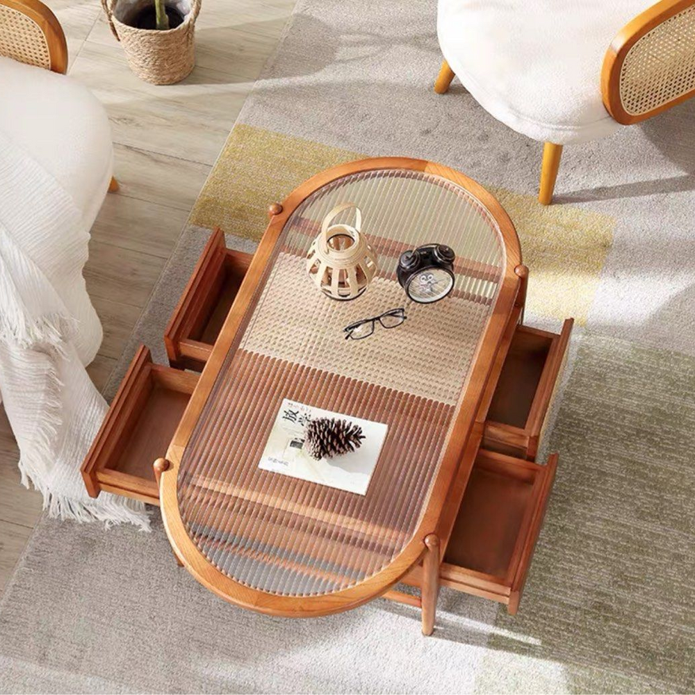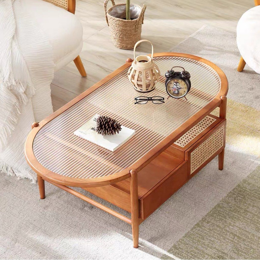 The ZHANG Modern Solid Wood Coffee Table is a stunning centerpiece crafted from high-quality Solid FAS oak wood, offering durability and timeless elegance. Its design incorporates fluted glass panels, adding a touch of contemporary sophistication while allowing light to flow through, creating an airy atmosphere. Additionally, the table features intricately woven rattan accents, providing a natural and organic element to the design. The combination of these materials results in a harmonious blend of modern and rustic aesthetics, making the ZHANG Coffee Table a versatile and stylish addition to any living space.