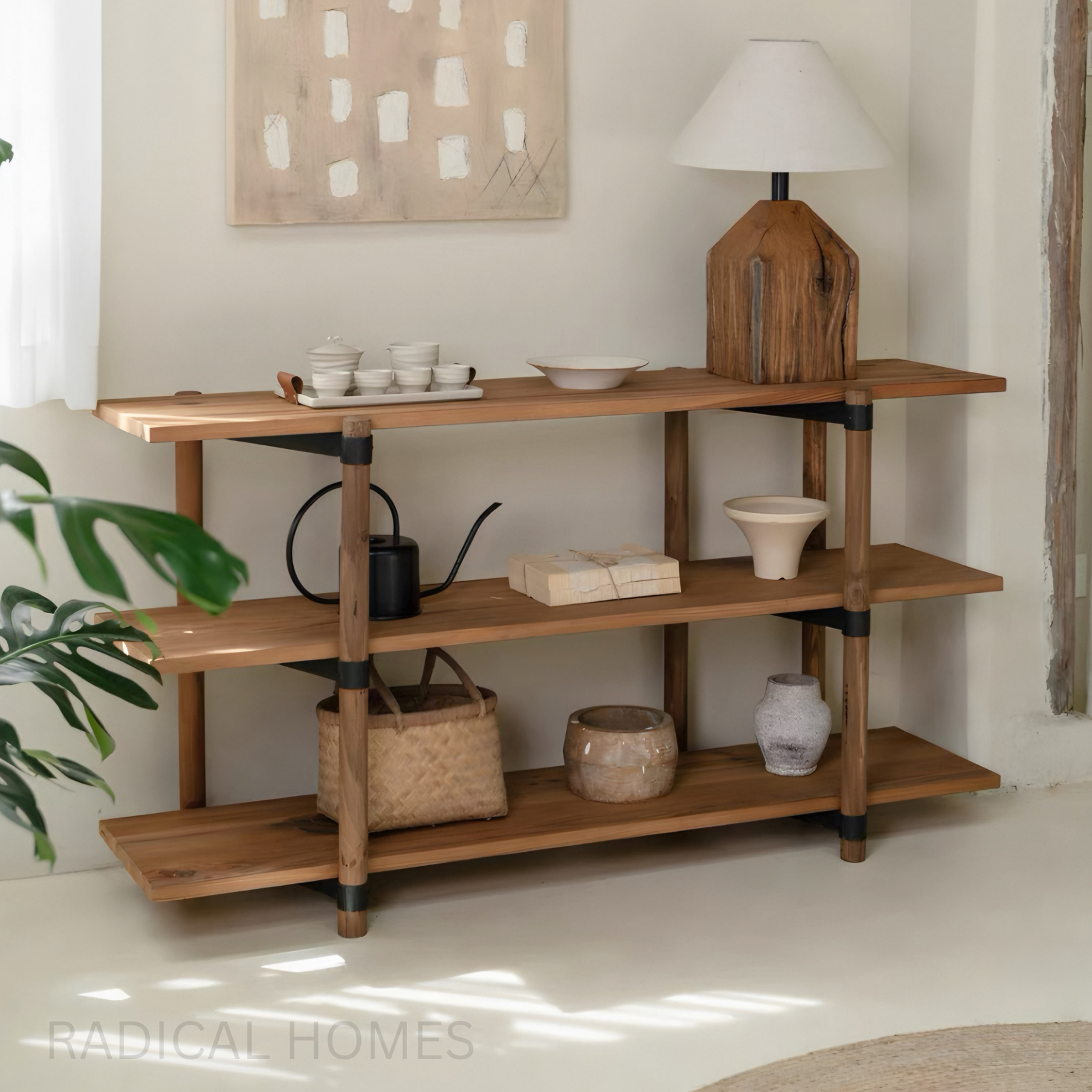 The SAVONA Rustic Solid Wood Display Shelf is designed to bring warmth, natural texture, and artisanal charm into any living space. Crafted from solid wood with a beautifully grained surface, this open-shelf design blends rustic aesthetics with modern minimalism. Its clean, tiered structure makes it a versatile showpiece in living rooms, entryways, studios, cafés, or boutique retail spaces. The three-tier layout provides generous open storage perfect for books, décor, plants, artwork, ceramics, or daily essentials. Rounded solid-wood posts support the structure, reinforced with accent metal bands that enhance both stability and style. At 150cm in length and 80cm in height, the SAVONA shelf offers substantial display area without overwhelming the space. Whether used as a display rack, shoe shelf, console table, or decorative room divider, SAVONA adds a grounded, natural presence that elevates any interior environment.