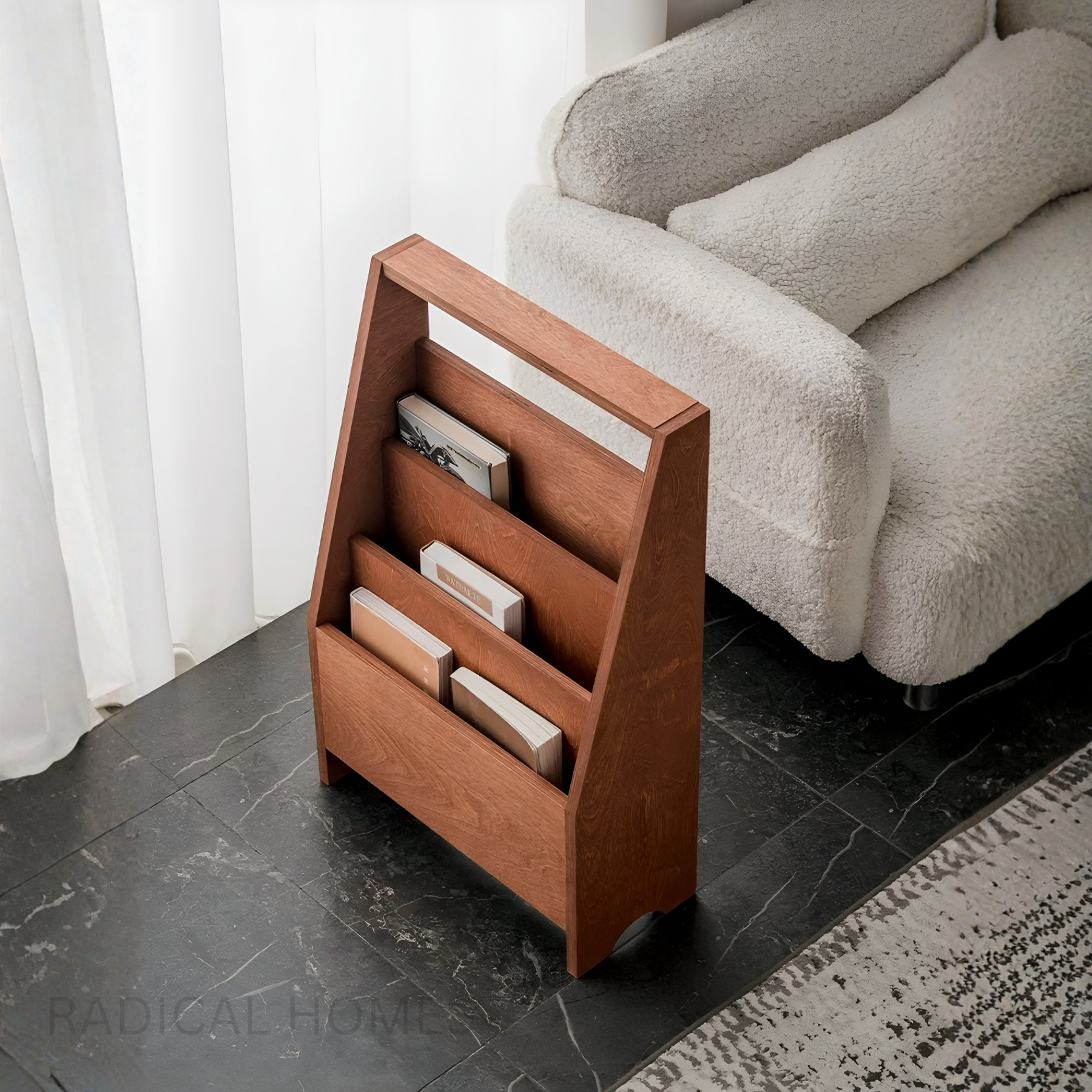 The ORPHEUS Rustic Magazine Rack is a compact, leaning magazine rack with tiered pockets and softened corners, bringing a warm, café-style touch to living rooms, entryways, or reading nooks while keeping books and periodicals neatly within reach.