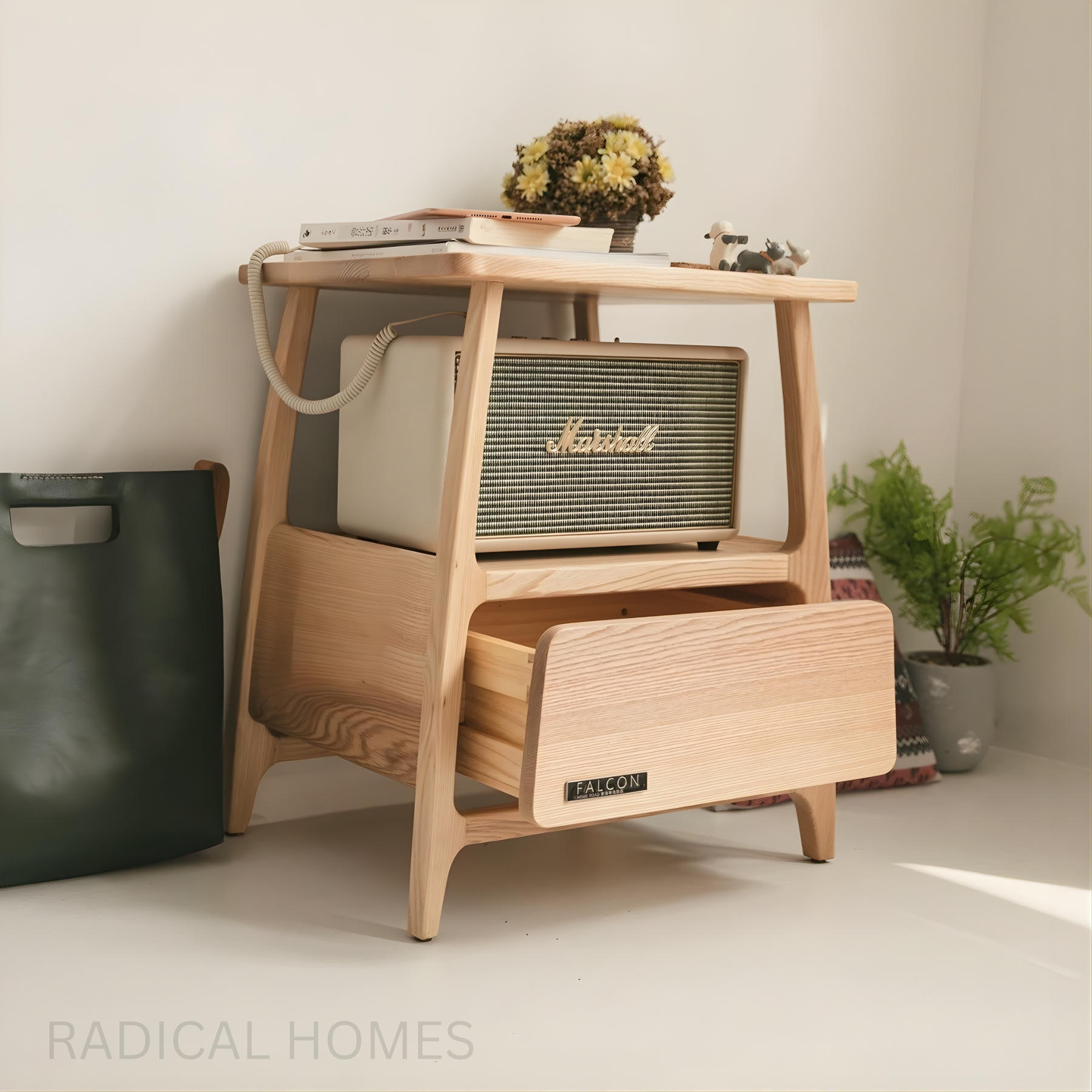 Designed for compact spaces, our SORREN nightstand brings reliable function and a Japanese-inspired style to any bedroom. Made from ash wood, it offers durability and a warm, natural finish that pairs well with Muji, Aesop, and rustic interiors. Its A-lined shape fits neatly beside the bed, providing a convenient surface for nighttime essentials.