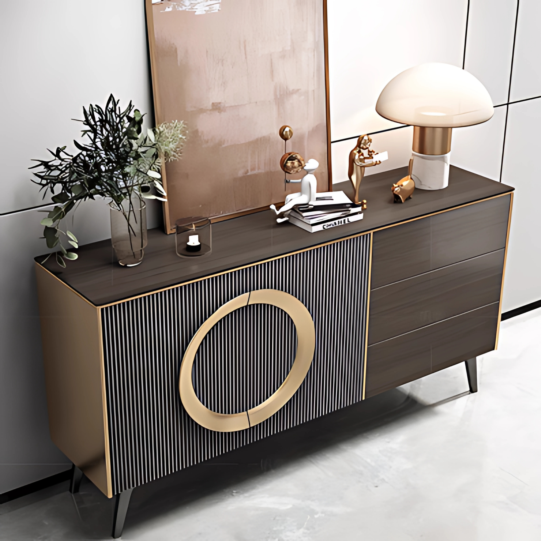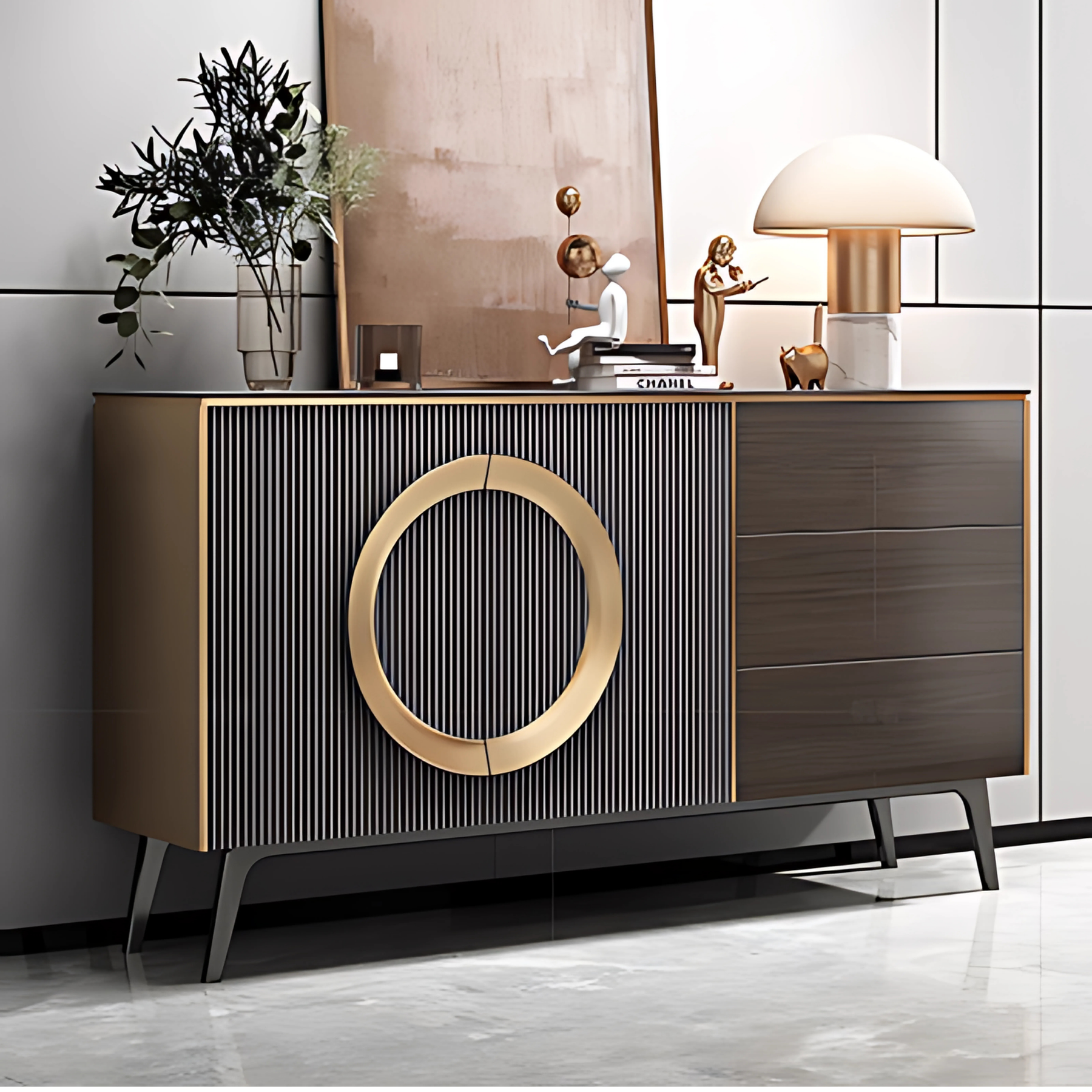 A statement sideboard with a sculptural gold ring pull, fluted door panel, and slender raised base. The cabinet offers a mix of concealed shelving and smooth-glide drawers, soft-close hardware, and a wipe-clean top in either matching wood finish or durable stone—ideal for entryways, dining rooms, or living spaces.