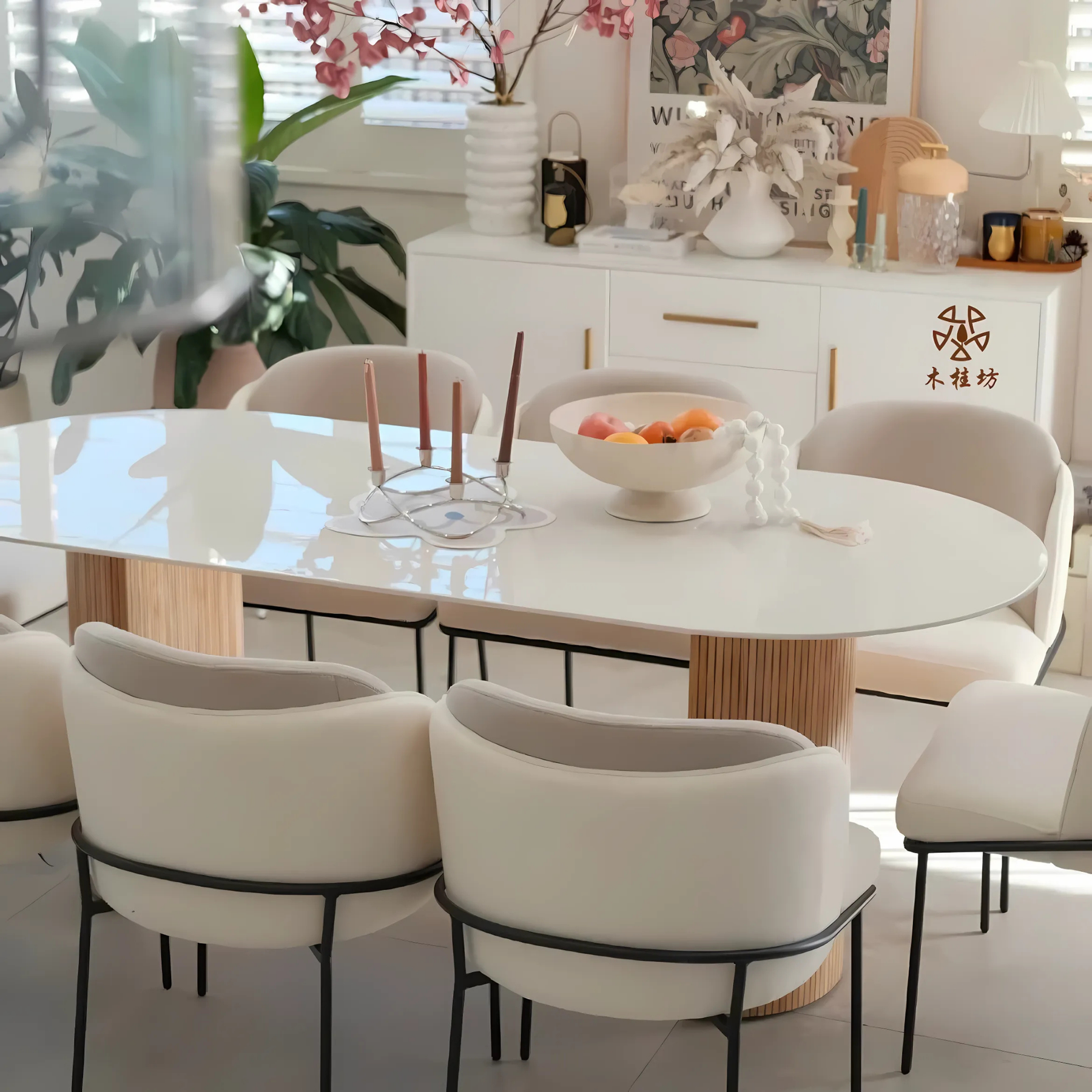A contemporary oval dining table crafted with a glossy rock slab top and solid cylindrical base in warm tones. Its soft “milk oil” finish offers a clean and inviting look, perfect for modern dining rooms. Optional bundles include four cushioned dining chairs with rounded backrests for added comfort and style.