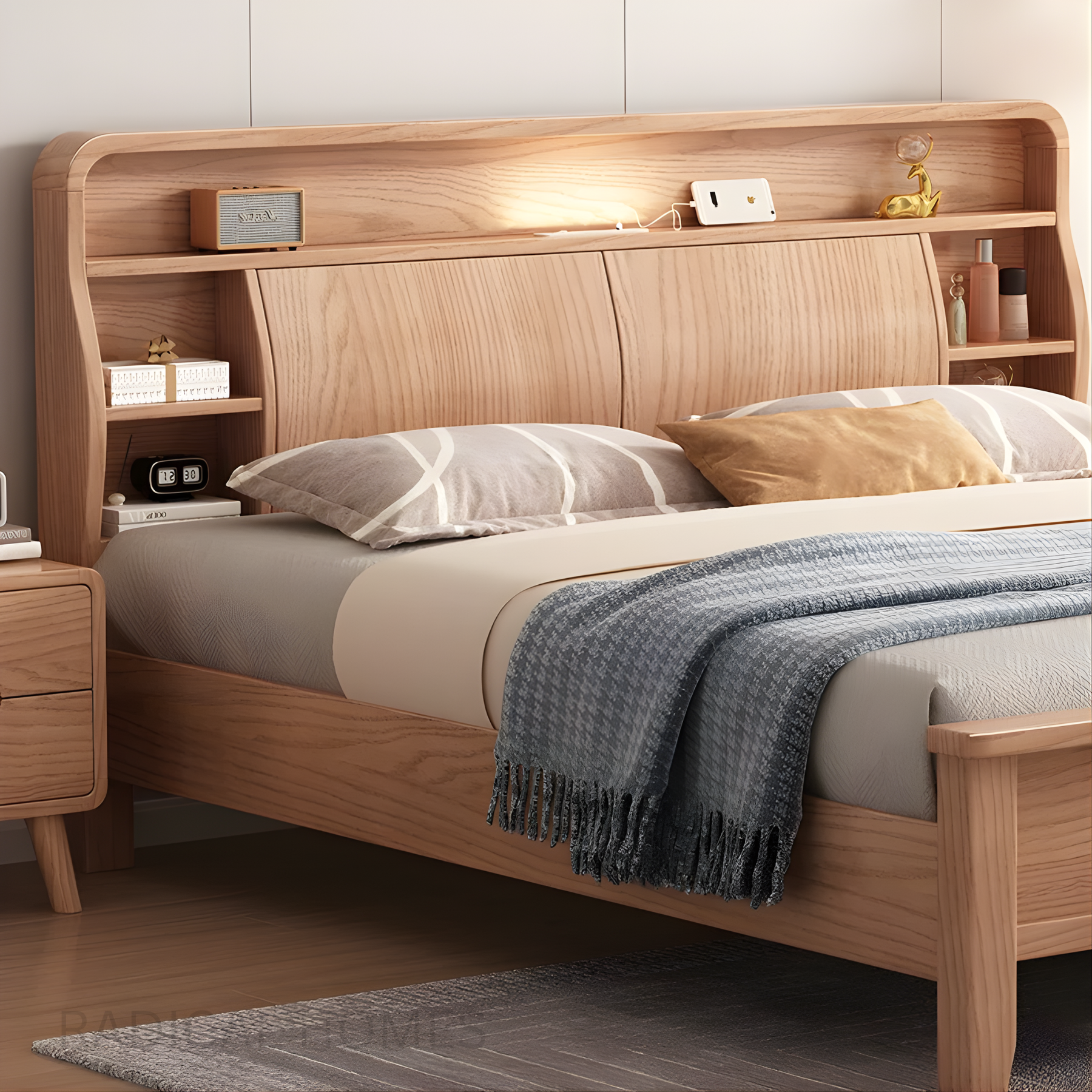 Constructed from solid white ash wood, our ELDON bed frame is a delight for both young and old with its integrated headboard hutch and LED light, ensuring safety and comfort in the middle of the night. Its clean outline highlights minimalist design influences, making it suitable for minimalist, zen, Muji, and Aesop interiors. The natural ash finish showcases rich grain patterns, adding warmth and character to bedrooms.