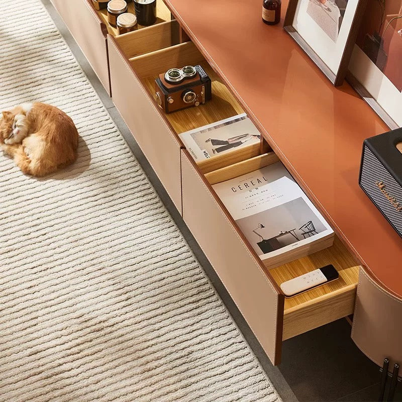 A modern long TV cabinet wrapped in premium saddle-leather veneer with rounded end-caps for a soft, high-end look. The slim metal legs keep the profile light while elevating storage off the floor. Interior shelves organise media devices; soft-close doors keep operation quiet; rear cable ports maintain a clean facade. Ideal for living rooms and media walls seeking a refined, Italian-inspired aesthetic.