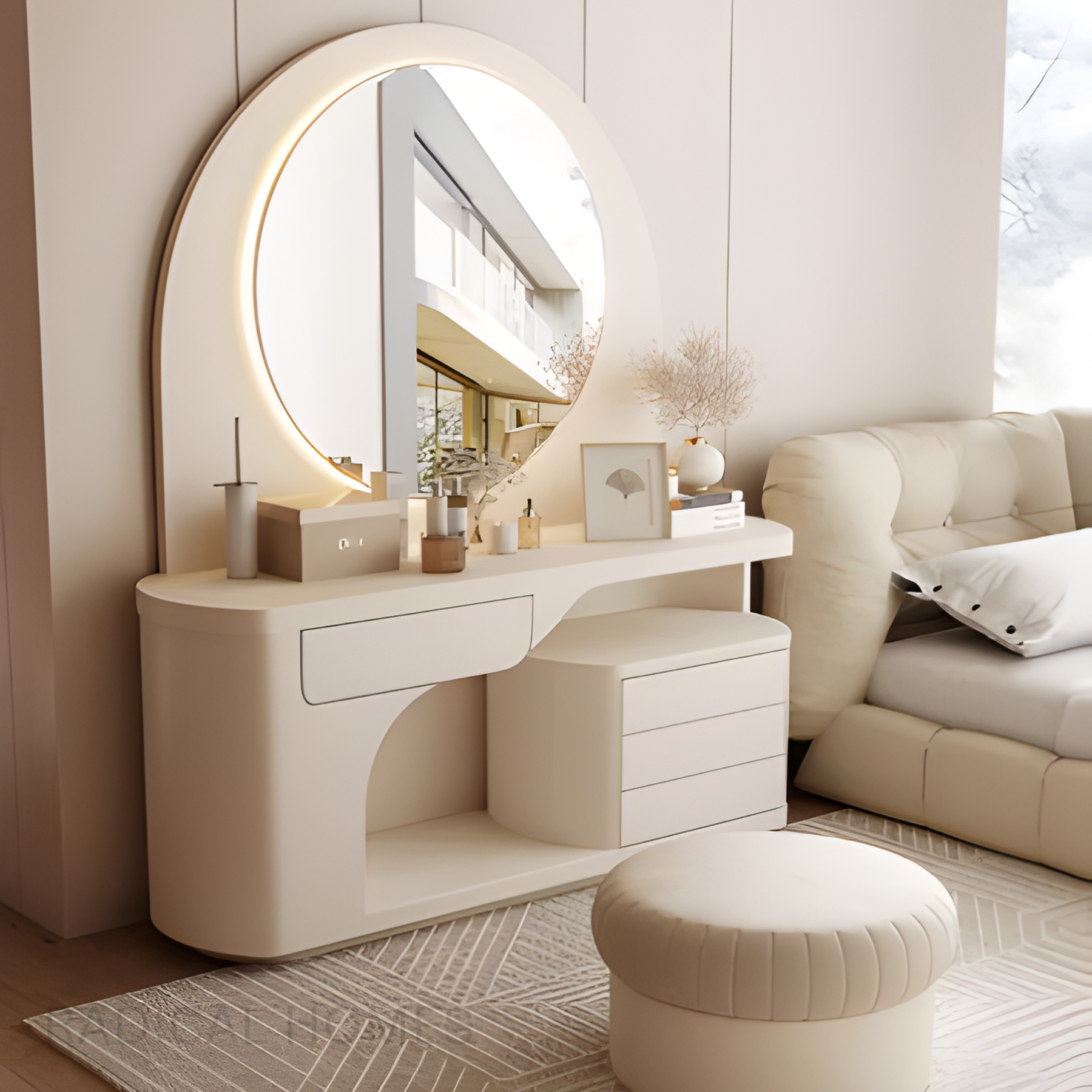 A unique design ideal for contemporary interiors, NARTHAN Modern Vanity Table is crafted from highly durable materials and features curved corners and an integrated LED mirror that fits seamlessly into minimalist bedrooms or dressing areas. A spacious chest of drawers allows for storage of beauty essentials and accessories.