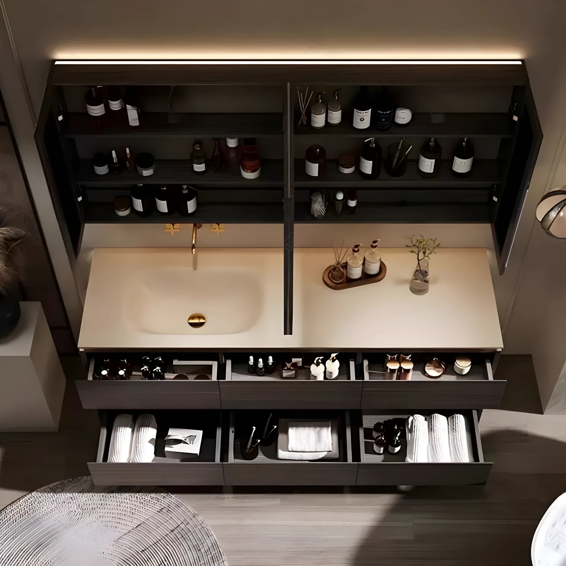 A sleek hotel-inspired vanity featuring a seamless ceramic stone basin, handle-free drawers, and a striking dark wood-grain finish. The integrated design pairs with a large smart backlit mirror, offering modern sophistication and functional storage. Ideal for luxury bathrooms and contemporary interiors.