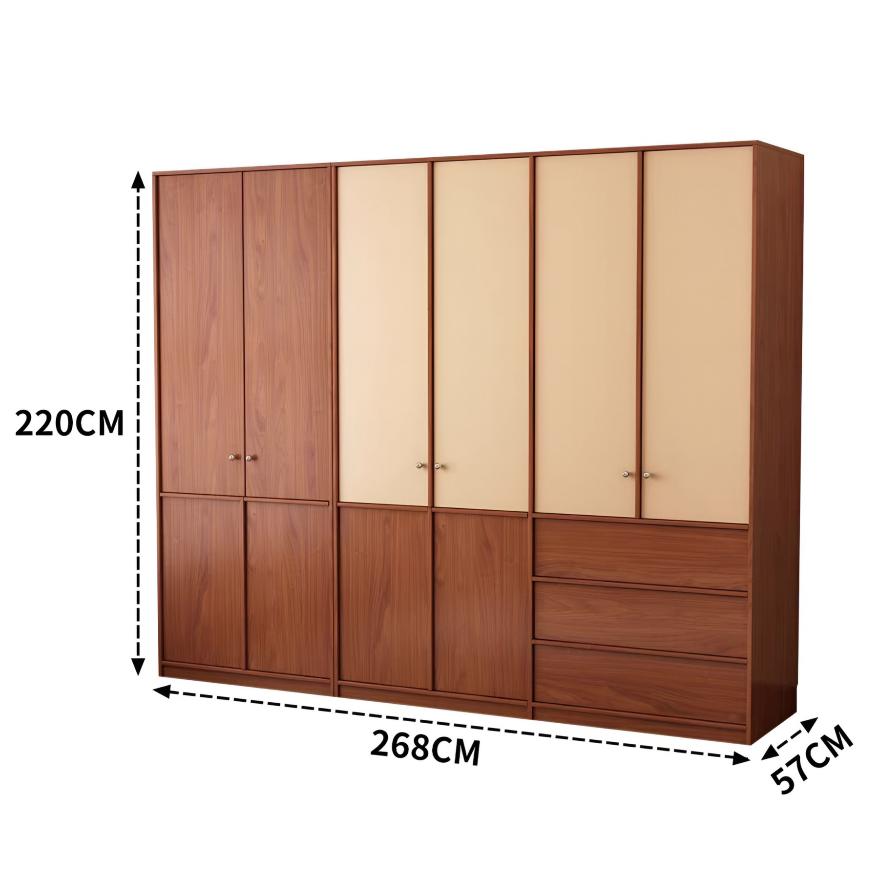 Classic antique-inspired wardrobe with clean vertical panels and warm caramel finish. Available in different combinations or single units, allowing flexible storage for bedrooms or study areas. Features a balanced mix of drawers and full-length doors, offering both hanging and folded clothing space.
