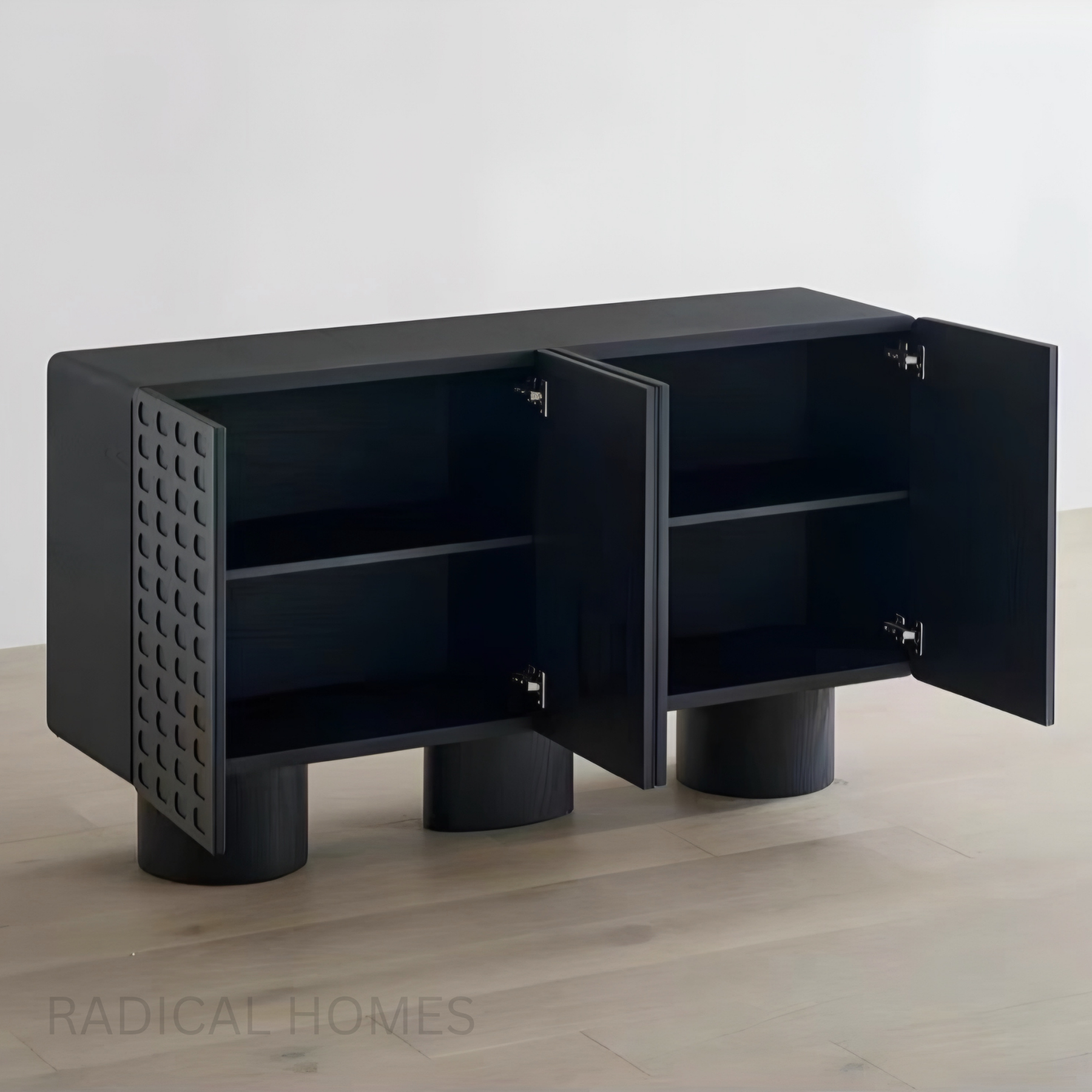 A Modern sideboard blending handcrafted texture with minimalist geometry. Its sculpted grid-pattern doors and cylindrical legs create a bold yet natural silhouette, ideal for adding warmth and character to entryways, dining rooms, or living spaces. Available in natural, black, or white finishes.