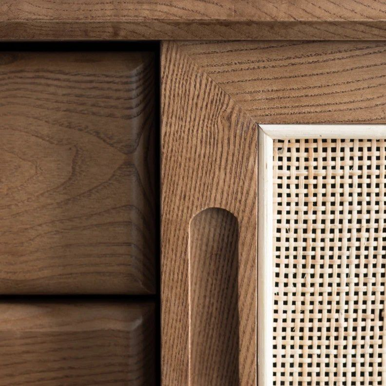 The TAVEN TV Stand is a striking example of harmonious design, where natural elements meet industrial strength. Crafted with 80% premium ash wood, its solid frame provides exceptional durability while showcasing the wood's unique grain patterns that bring warmth and character to any room. The 10% vine accents delicately interweave, adding an organic touch and a hint of rustic charm. Complemented by the 10% metal elements, this TV stand exudes a modern yet earthy vibe, creating a balanced fusion of materials that speaks to both nature and contemporary design. Perfect for those seeking a versatile piece that anchors a living space with both functionality and style, the TAVEN TV Stand stands as a testament to craftsmanship and innovation.